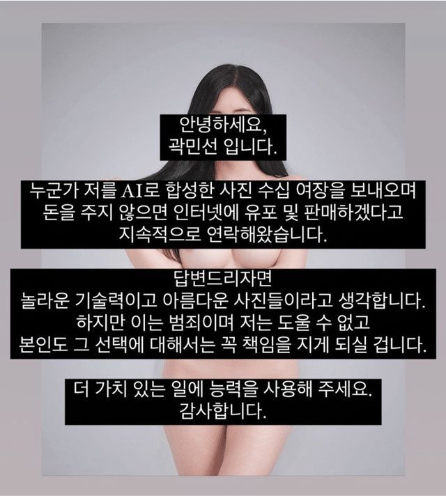 공개된 사진은 AI로 합성된 나체 이미지로 추정되어 더욱 충격적이었습니다. 하지만, 곽민선은 담담하게 "이는 범죄"라며, 해당 행위에 대한 강력한 대응 의사를 밝혔습니다.