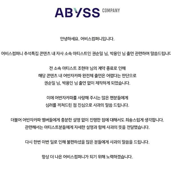 어비스 컴퍼니는 가족사진 콘텐츠에서 어반자카파 멤버가 보이지 않는 사진을 게시한 데 대한 논란에 대해 "계약 종료로 인해 해당 콘텐츠에서 어반자카파 완전체 출연은 어렵다"고 밝혔으며 논란이 가중되고 있습니다.