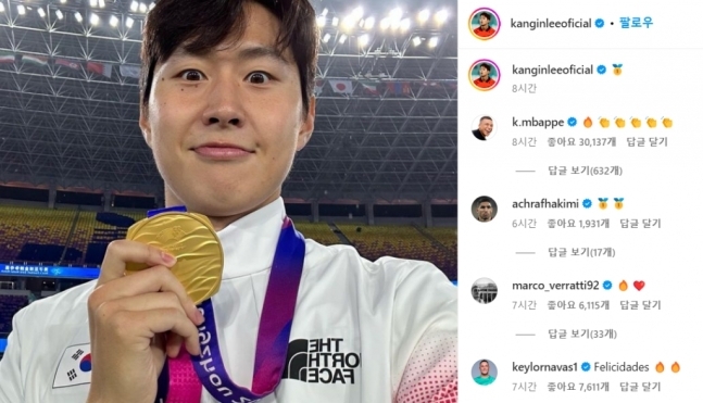 이강인이 SNS에 금메달을 손에 쥔 사진을 올리자 PSG 선수들이 한데 모였다. 먼저 킬리안 음바페가 불꽃 이모티콘과 함께 박수 이모티콘 다섯개를 남기며 댓글을 남겼다. 풀백 아슈라프 하키미(25·파리 생제르맹)도 1등 메달 이모티콘으로 금메달 획득을 축하했다.