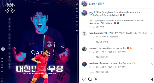 그 밖에 PSG 공식 계정을 비롯해 마르코 베라티, 누노 멘데스, 곤살루 하무스 등 PSG 동료들이 댓글을 남기고 이강인을 축하했다.