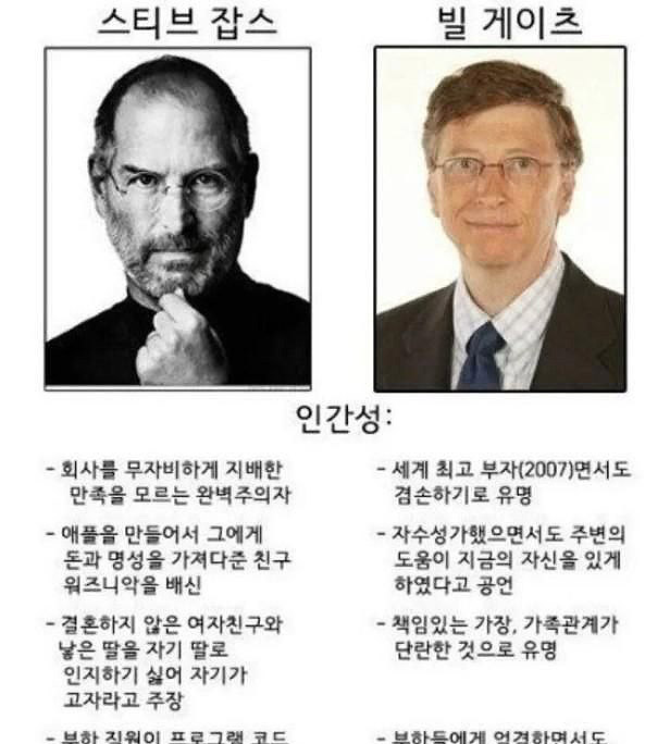스티브 잡스 VS 빌게이츠 by archivememe 2023. 9. 4. 스티브 잡스 VS 빌게이츠 두사람을 비교해보자.. 잡스는 자신만을 위해서 산 녀석인데 생각보다 명성이 대단, 실제 인류에 좋은 일은 빌게이츠가 다하고 욕만 먹음. 공유하기 게시글 관리 읽어볼만한 이야기 아마존 베조프 인성 일본 해변 남녀 인터뷰 스티브잡스가 말하는 망해가는 조직 특징 빌게이츠가 이야기하는 인구 감소