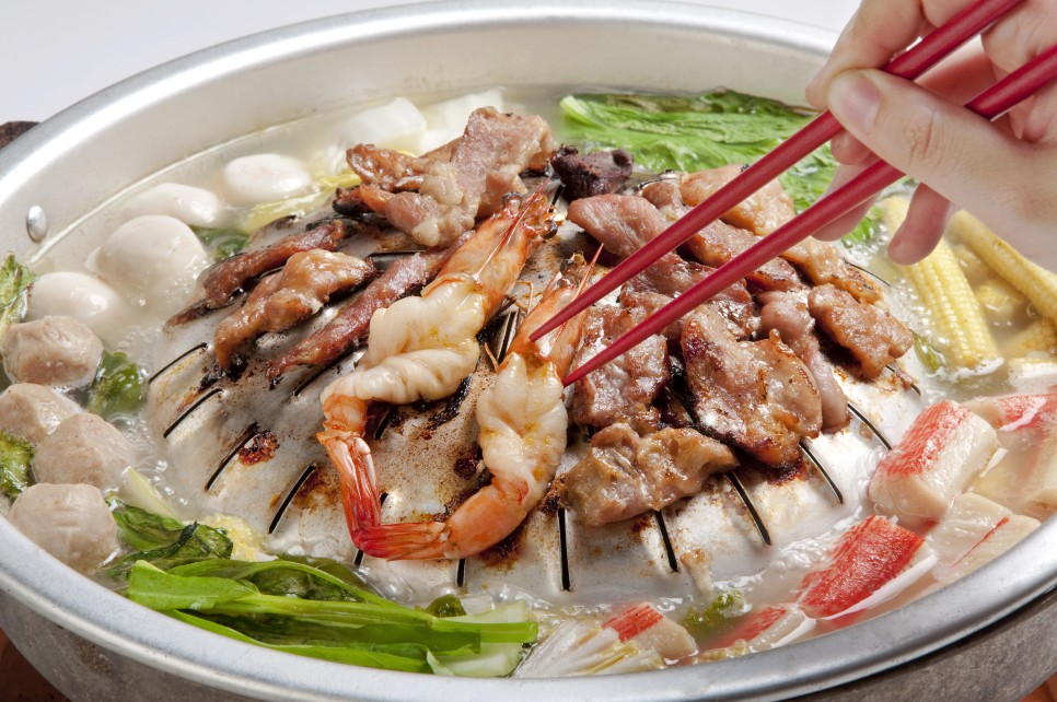 작은 구멍이 여럿 뚫린 원형의 오목한 고기용 그릴과 그릴 테두리의 파인 홈에 야채와 육수를 넣고 같이 먹을 수 있는 샤브샤브 느낌의 특이한 모습을 하고 있다.