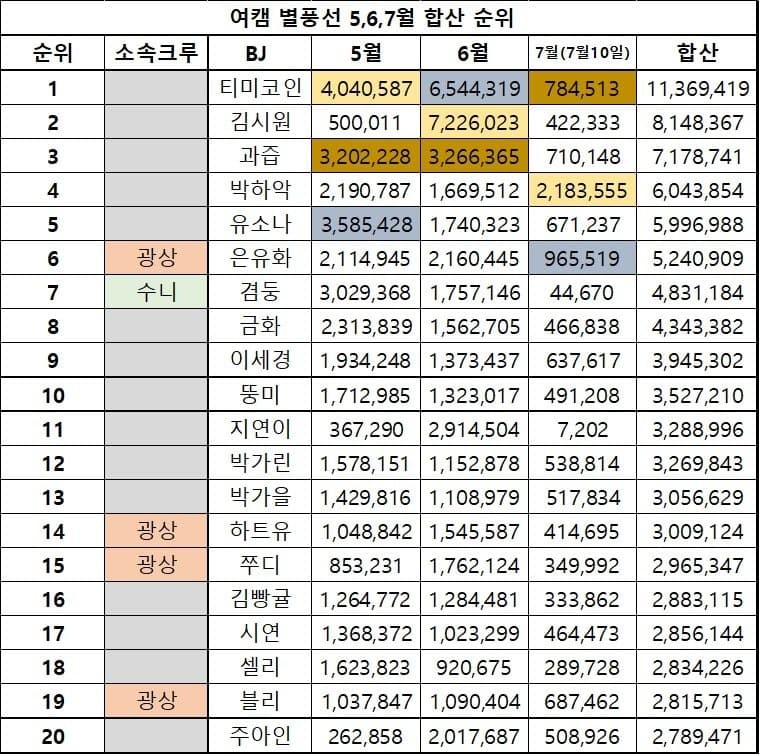 작년 여캠 수익 (2023년 7월. 숫자는 원이 아니라 별풍선 갯수. 개당 110원)