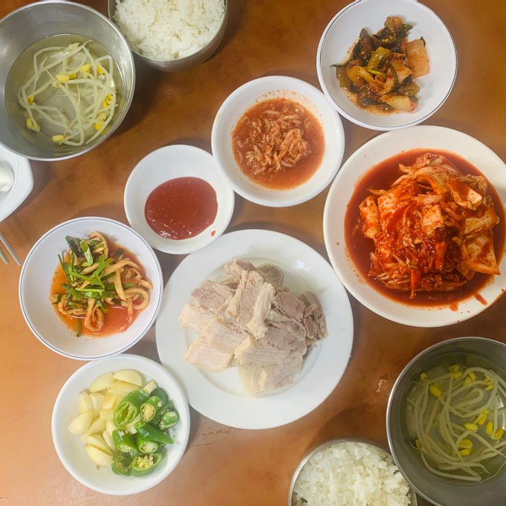 방산시장 앞에 있는 이 보쌈집. 실내는 매우 작아요 보쌈정식 1.2만원이네요. 혼밥도 가능합니다. 현금만 가능! 천하보쌈보다 반찬은 조금 단출하지만 보쌈이 더 두텁고 쫀쫀해요. 이 집은 보쌈에 방점이 있는 집 김치도 조금 달긴 해도 시원하고 맛있어요. 개인적으로는 조금 덜 달았으면 싶지만 생마늘이랑 같이 먹으니 칼칼하니 딱 좋더라고요. 광장시장 구경하고 오기에 좋은 위치입니다. 추천해요
