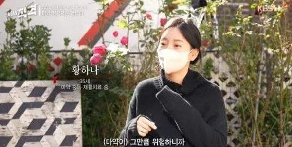 황하나는 “지금은 정말 안 할 자신이 있다”며 “치아가 깨져서 고쳐야 하고 얼굴 피부도 너무 망가졌다. 종아리는 온통 메스버그(몸에 벌레가 기어다니는 듯한 환각 증세를 해소하기 위해 과하게 긁다 상처 나는 필로폰 투약 부작용 중 하나)다. 흉터가 이렇게 많은 것도 처음 알았다”고 털어놨다.
