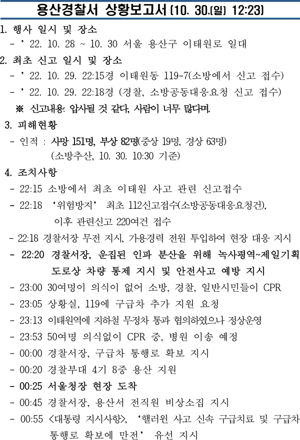 특히 용산경찰서 보고서에는 실제 사고가 발생했던 해밀톤 호텔 골목에 많은 인파가 몰려 위험이 우려된다는 내용이 담긴 것으로 알려졌다.