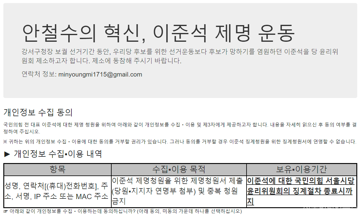 홈페이지에는 '안철수의 혁신, 이준석 제명 운동'이라는 제목과 함께 "강서구청장 보궐선거 기간에 우리 당 후보보다 후보의 실패를 바라던 이준석을 당 윤리위원회에 제소하자"라는 내용이 포함되어 있다.