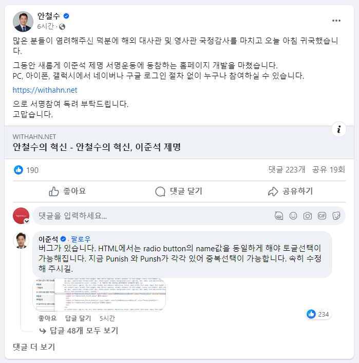 이번 홈페이지 개설은 그동안 '구글 폼'을 통해 징계 동참 서명을 받던 것을 한 단계 더 발전시킨 것으로 보인다. 이에 이준석 전 대표는 안 의원의 페이스북 글을 공유하면서 "버그가 있다. 수정해 주길"이라고 댓글을 남겼다.