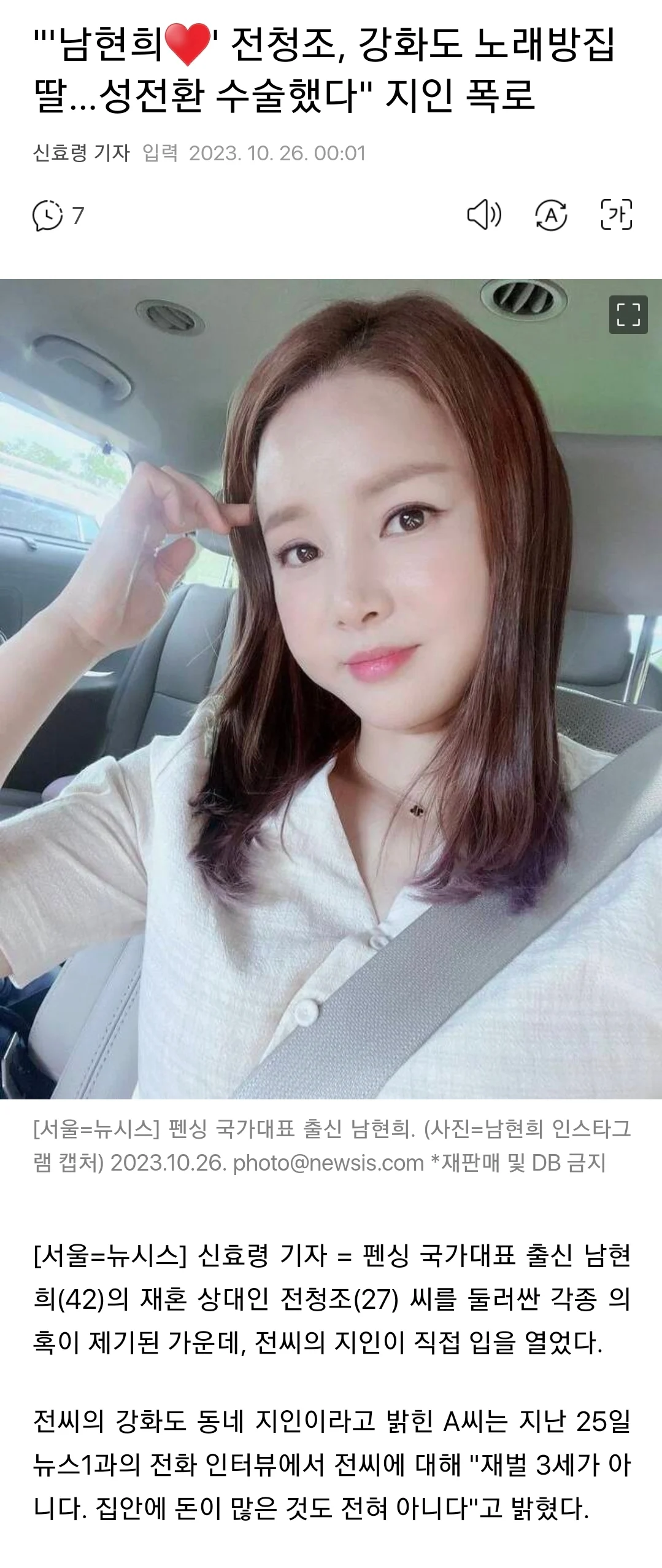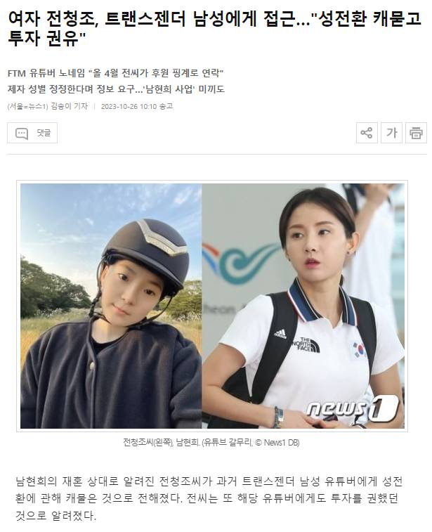 남현희는 26일 여성조선과 인터뷰에서 “전청조가 성전환 수술을 받았다”며 “교제 전부터 알고 있었고 과거에는 여자, 지금은 남자”라고 했다.