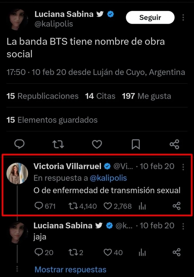 26일(현지시간) 아르헨티나 BTS 팬클럽(BTS 엔 아르헨티나)에 따르면 다음 달 19일 결선 투표를 앞둔 자유전진당 빅토리아 비야루엘(48) 부통령 후보가 2020년 BTS를 향해 조롱 조로 불쾌감을 드러내는 트윗을 썼던 것으로 나타났다.