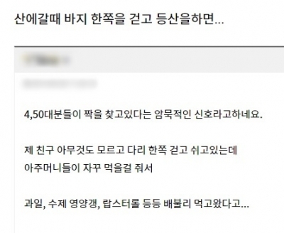 애인을 찾으러 온 사람들만의 암호도 있다. 산악회 활동을 하는 C씨는 "남자들의 경우 한쪽 바지를 걷고 있으면 '아직 짝을 못 만났다'는 의미다"라며 "여성들은 등산과 어울리지 않는 진한 화장과 옷차림을 한 경우가 많다"고 말했다.