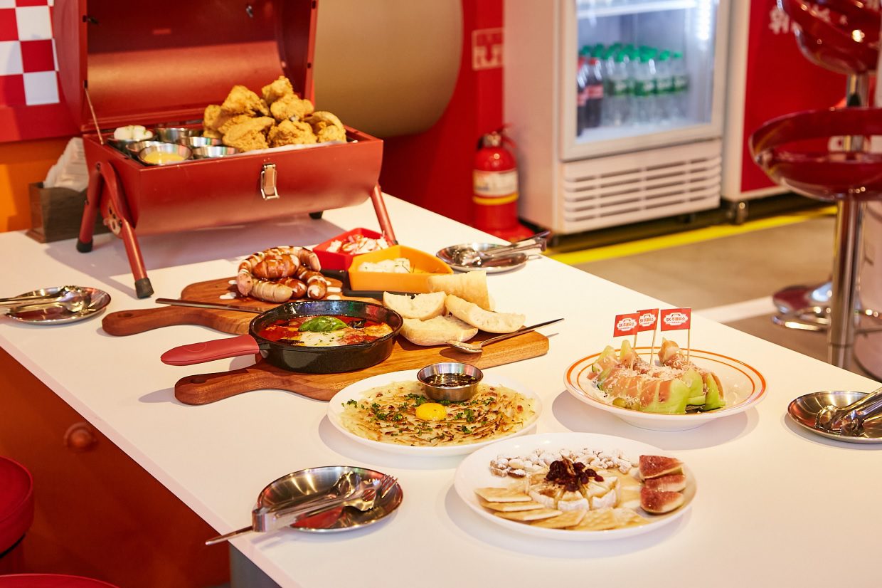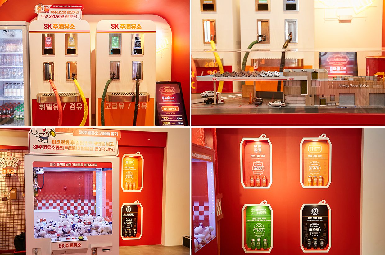 SK 로고 행복날개 색상인 빨간색과 주황색으로 꾸민 이 공간을 SK주유소를 떠올리게 하는 볼거리들로 채웠다.