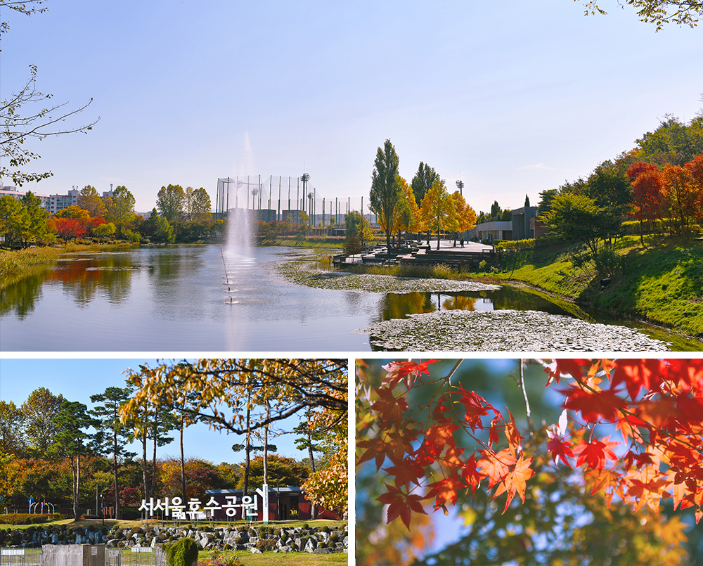 너른 호수가 한가운데 있는 서서울호수공원. 호수가 주위로 핀 붉은 ‘화살나무’ 단풍이 주변 풍광과 어우러진 모습이 마치 모네의 작품 같다.