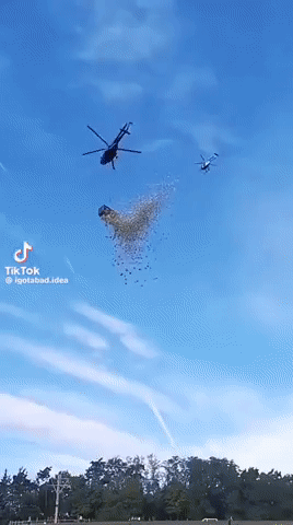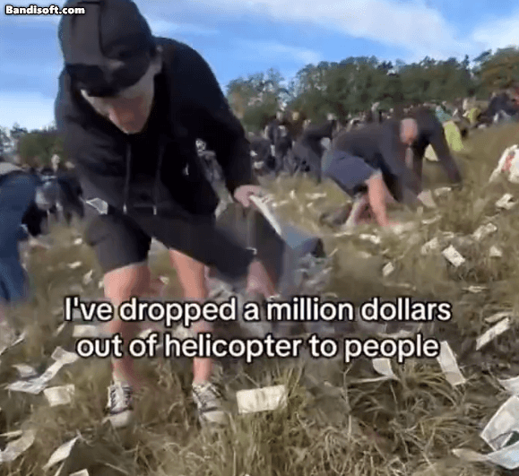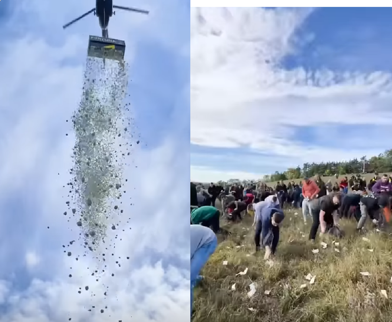 영상을 보면 헬기에 매달린 컨테이너에서 1달러짜리 지폐 다발이 뿌려진다. 지폐는 하늘에서 꽃가루처럼 흩날렸고, 현장에 있던 사람들은 이 돈을 줍기 위해 우르르 몰려든다. 행사는 체코 프라하 인근의 한 소도시에서 진행됐다.