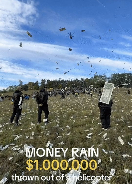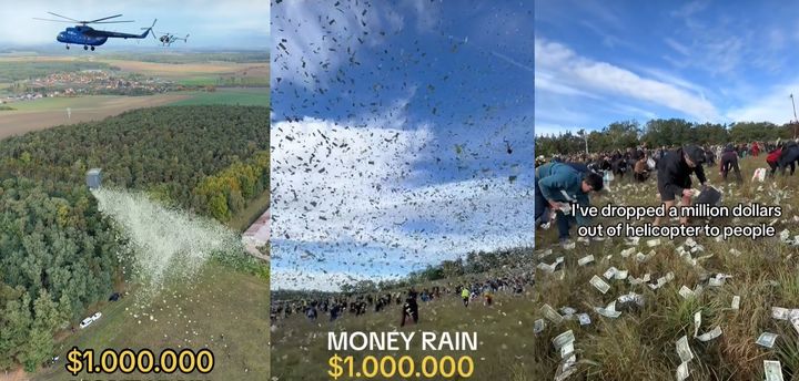 체코의 한 방송인이자 인플루언서가 헬기를 타고 상공에서 현금 100만 달러(약 13억5000만원)를 뿌렸다. 영화 홍보 목적으로 기획된 이 이벤트에는 4000여명이 몰려 땅에 떨어진 돈을 줍는 진풍경이 벌어졌다.