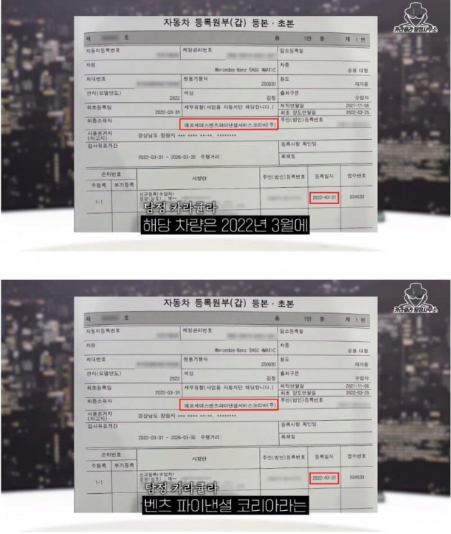지난 1일 유튜버 카라큘라는 전씨가 타고 다니던 벤츠 S클래스 자동차 등록원부를 공개했다. 지난 3월 '벤츠 파이낸셜 코라아'라는 리스 회사 명의로 출고된 이 차의 실소유주는 남현희인 것으로 드러났다.