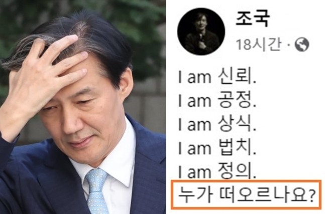 조 전 장관은 2일 오전 10시쯤 페이스북에 "I am 신뢰. I am 공정. I am 상식. I am 법치. I am 정의"라고 적었다. 이는 한국어와 영어를 섞어서 사용해 온라인 밈(유행어)으로 확산된 '전청조 화법'을 패러디한 것이었다.