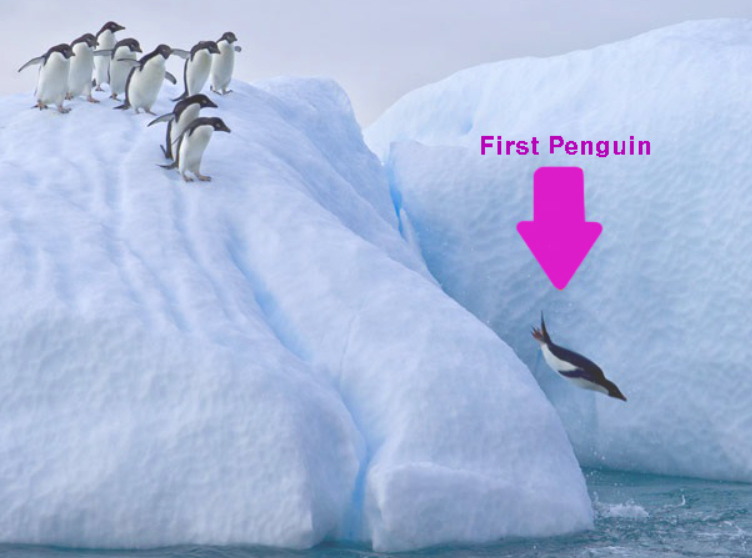펭귄들은 아이를 낳게되면 부모 펭귄이 생선을 사냥하러 물에 무리지어 뛰어드는데, 펭귄들은 물에 있는 포식자가 무서워서 머뭇거린다. 그 때, 첫번째로 뛰어드는 펭귄은 물에 서식하는 포식자에게 공격을 먼저 당하기 때문에 첫번째로 뛰어드는 용기있는 펭귄을 보면 다른 펭귄들이 안심하고 그 펭귄처럼 물에 무리지어 뛰어든다고 하여 붙은 이름이다.