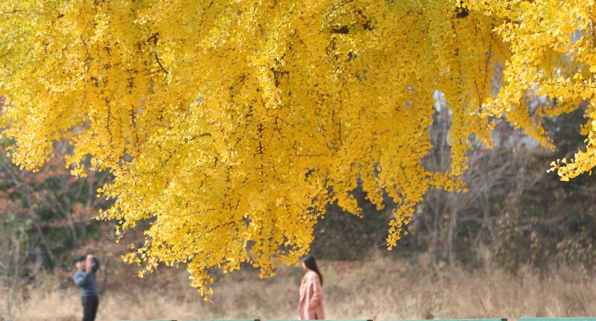 노란색 은행잎은 새파란 가을 하늘과 어우러져 한 폭의 그림을 자아냅니다.
