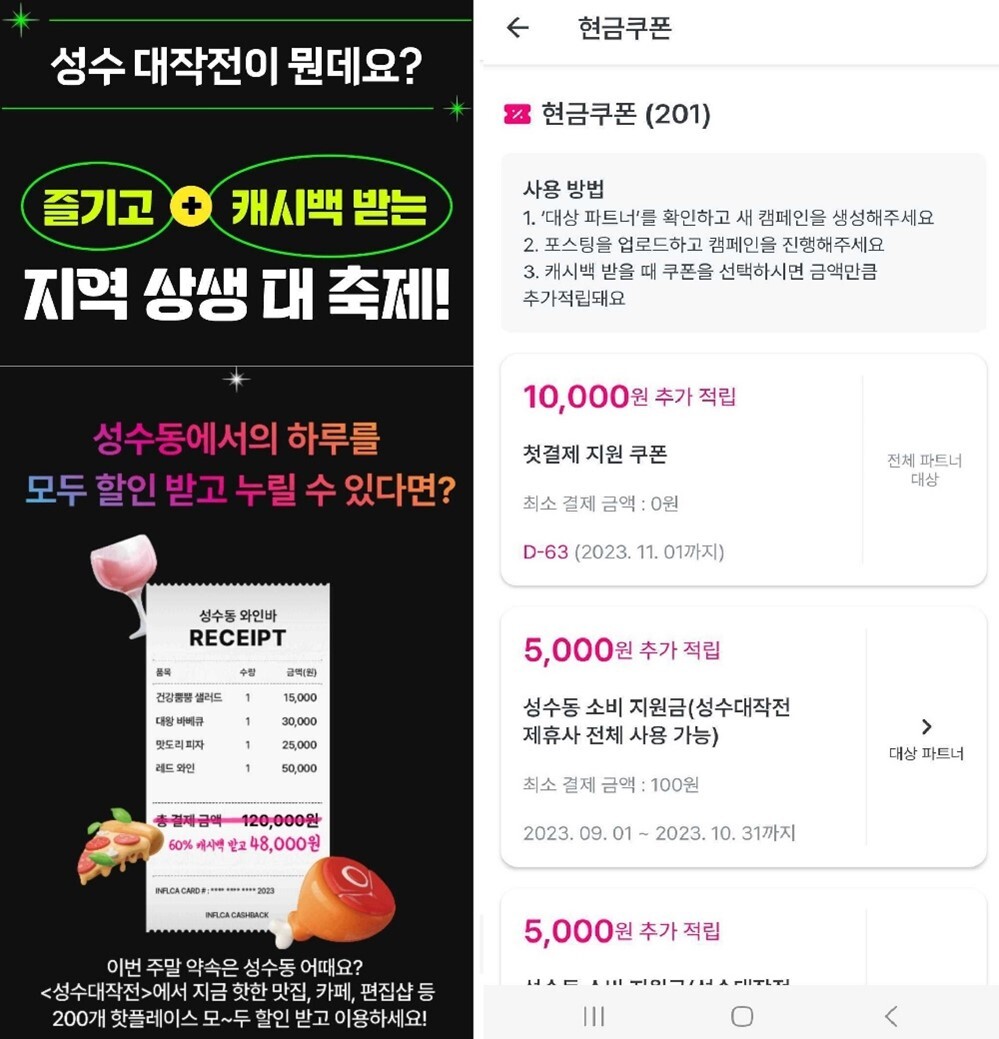 이제 이 카드를 가지고 성수동에 있는 200개의 제휴사를 즐기면 돼요! 제휴사에서 긁고, 인스타그램에 후기올리고! 캐시백 받기 +거기에 지금 성수대작전 기간이라서 쇼핑지원금 5,000원 쿠폰까지 덤!? 이 쇼핑지원금 5,000원 쿠폰이 즉시 출금가능한 현금형 적립쿠폰이에요! 인플카app의 마이페이지에 들어가보면 총 100만원의 쿠폰이 들어와 있는 것을 볼 수 있어요!