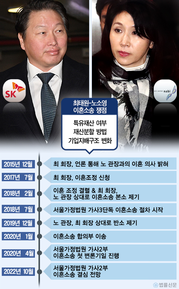 지난해 12월 1심 재판부는 “두 사람은 이혼하고 최 회장이 노 관장에게 위자료 1억 원과 재산 분할분 665억 원을 지급하라”고 판결했다. 하지만 양측 모두 불복해 항소하면서 이혼소송은 진행 중인 상황이다.