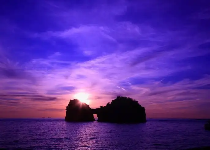 시라하마에서 보는 엔게츠도섬를 향해 지는 석양은 일본의 석양 100선에 선정되기도 했다.