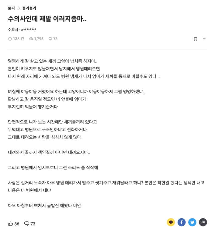 어떤 수의사가 블라인드 커뮤니티에 고충을 이야기했다.