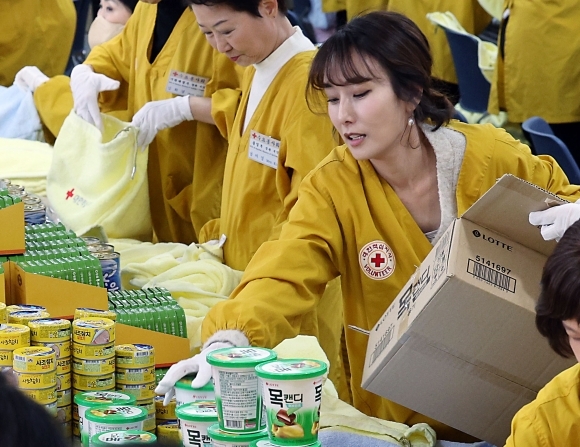 한동훈 부인 진은정 씨가 15일 오전 서울 중구 소파로 대한적십자사 서울사무소 앙리뒤낭홀에서 2023 사랑의 선물을 제작하고 있다. 연말 이웃 돕기 적십자 봉사활동에 나섰다.