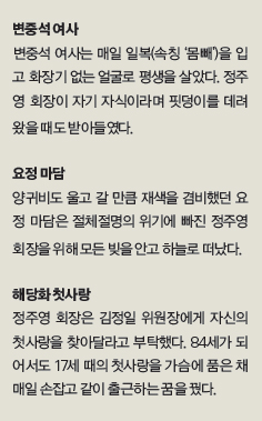 불길해 알아보니 정 회장이 병원에 실려가 중태라는 소식이 들려왔고, 얼마 후인 2001년 3월 21일 정 회장은 영면에 들었다.
