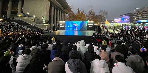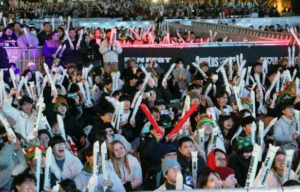 19일 서울 구로구 고척 스카이돔에서 열린 ‘2023 리그오브레전드(LoL·롤) 월드 챔피언십’ 결승전을 맞아 광화문 광장에서는 국내외 e스포츠팬 1만5000명이 모여 응원전을 벌이고 있다. e스포츠로 광화문광장에서 거리 응원전이 열리기는 이번이 처음이다.