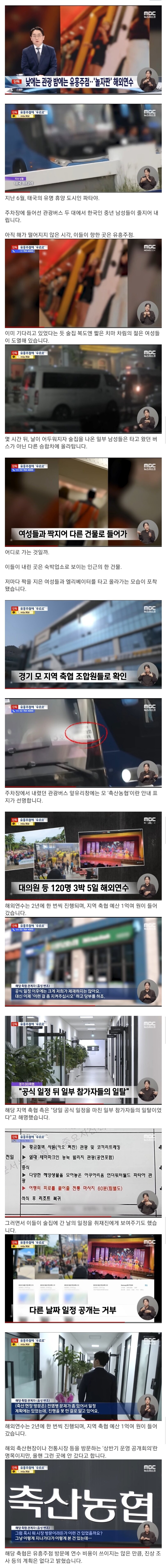 19일 MBC에 따르면 축협 남성 조합원들은 지난 6월 태국 휴양 도시 파타야를 방문해 벌건 대낮부터 유흥주점으로 들어갔다.