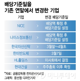 한국자산신탁 역시 내년 정기 주주총회에서 배당액을 확정한 이후 3월말~4월초에 배당 기준일을 정하겠다고 공시했다. HL홀딩스와 현대건설도 주주총회 이후 혹은 이사회에서 결정한 날로 배당 기준일을 정하기로 했다. 한미반도체는 올해 실적에 대한 배당금 지급 기준일을 내년 3월7일로 확정했다.