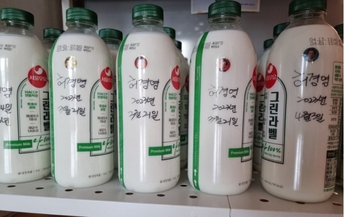 타회사 우유제품에 허경영의 스티커나 이름을 적고