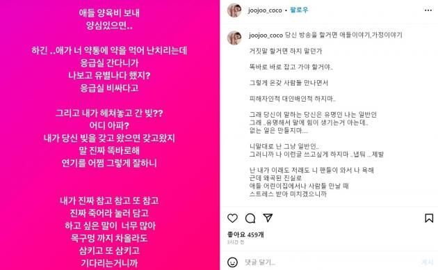 이어 "내가 이래도 저래도 네 팬들이 와서 나 욕 한다. 왜곡된 진실로 아이들 어린이집에서나 사람들 만날 때 스트레스받아 미치겠다. 대인배 할 거면 자식한테나 대인배 소리 듣도록 해라"고 말했다.