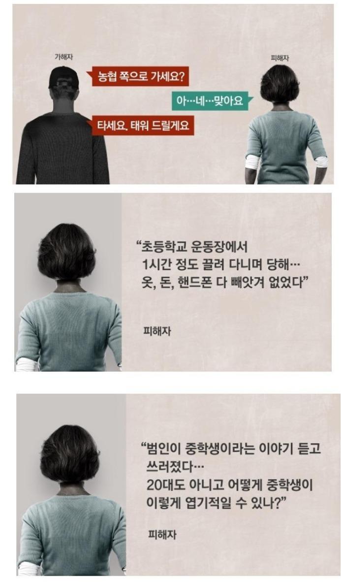1시간 가까이 범행을 이어간 중학생성폭행 10새끼는 B씨의 휴대전화와 현금 10여만원을 빼앗아 달아났다.