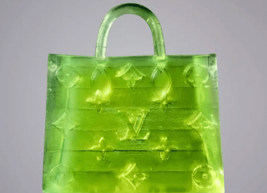 3D 프린터를 통해 형광색으로 제작된 이 가방은 약 400만원 정도에 판매하는 루이비통의 유명모델인 '온더고 토트백'을 모델로 했다. 현미경을 통해 살피면 가방 전면에 루이비통의 로고인 'LV'가 선명하게 보인다.