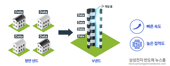 반도체 업계에서는 집적도를 높이기 위한 기술 개발을 지속하고 있습니다. 해결책을 내놓은 것은 삼성전자였는데요. 삼성전자는 지난 2013년 낸드플래시를 수직으로 쌓아 올리는 적층 기술을 적용하기 시작했습니다.