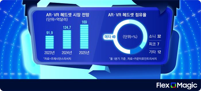 프레시던스리서치에 따르면 AR·VR 헤드셋 시장 규모는 지난해 91억9000만달러에서 2026년 229억달러로 커질 것으로 보인다. 현재는 50만원 이하 저가 제품에서는 중국산 업체가 점유율을 확대 중이며 100만원 대 근접 제품군에서는 메타와 소니 등 기업들이 점유율에서 우위를 점하고 있다.