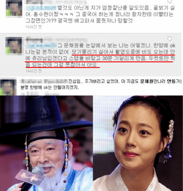 이뿐만 아니라 “주인공들은 전체적인 분위기를 주도하는 사람들이기 때문에 힘들고 어렵더라도 늘 유쾌하고 편한 얼굴로 작업에 임해주면 스태프나 주변 배우들도 같이 힘이 난다”고까지 말했고 이때 문채원의 표정이 안 좋아진 사실까지 드러나 인성 논란에 불을 지폈다. 문채원 인성 논란은 해피투게더 출연 당시에도 있었는데 해피투게더 촬영 당시 김준호의 상황극에 대해 귀찮은 듯 전혀 받아주지 않는 장면이 방송돼 방송태도 논란이 있기도 하였는데, 방송 중 물총을 맞는 장면이 있었는데 그때 당시 문채원은 끊이지 않는 물총 세례에 짜증을 내기도 했다. 싸해진 분위기를 감지한 유재석은 눈치를 보며 문채원이 물총을 안 맞도록 패널로 가려줬다고 알려졌다.