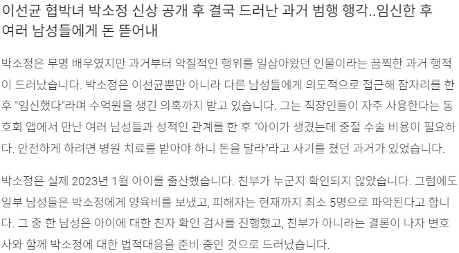 "굿플레이스 마담 김남희와 같은 아파트에 거주하고 자신이 해커라며 공갈 협박을 일삼은 미혼모 박소정 (95년생, 원주 출신)에게 사기, 협박, 꽃뱀 피해를 당하신 분과 아동 학대를 목격하신 분의 제보를 기다린다"는 박소정의 실물사진과 글이 게시됐다.