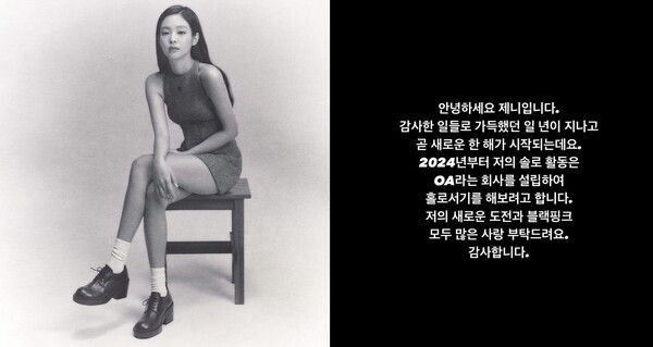제니는 12월 24일 1인 기획사 '오드 아틀리에(ODD ATELIER, OA)' 설립 소식을 알리며 가장 먼저 개별 활동을 공식화했다.