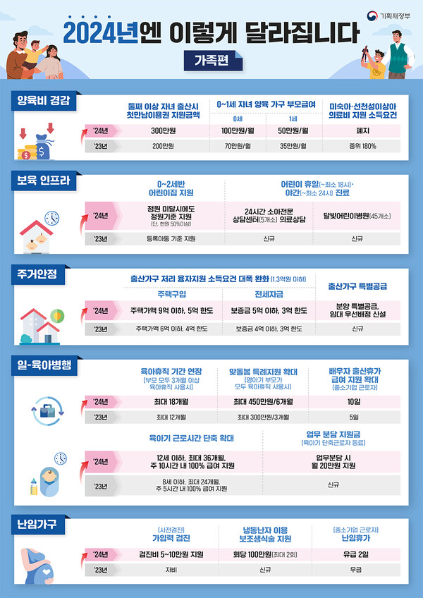 정부는 2024년부터 둘째 이상 자녀 출산 시 출산장려금을 200만 원에서 300만 원으로 인상한다. 또 0~1세 자녀 양육 가구 부모 급여를 월 100만 원에서 120만 원으로 인상할 예정이다.