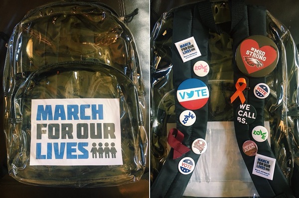 지난 2월 14일, MSD 고등학교에서는 17명이 사망하고 14명이 부상을 당한 총기 난사 사건이 있었다. 끔찍한 시간이 지나고 학교 측은 학생 보호라는 명목 아래 새로운 학생증 배지와 함께 전교생에게 투명한 백팩을 나눠주고 이 백팩을 의무적으로 착용하도록 했다.