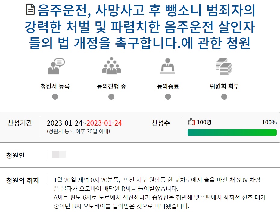 그는 인천 한 의원에서 일하는 현직 의사로 병원 직원들과 회식한 뒤 귀가하는 길에 사고를 냈다. 당시 A씨의 혈중알코올농도는 0.069%로 면허정지 수치였다. 그는 경찰 조사에서 "사람이 아니라 물체 같은 것을 친 줄 알았다"며 "피해자에게 죄송하다"고 진술했다. B씨는 사고가 나기 1년가량 전부터 배달 대행업체에서 일한 것으로 전해졌으며 사고 당시에는 햄버거를 배달하던 중이었다.