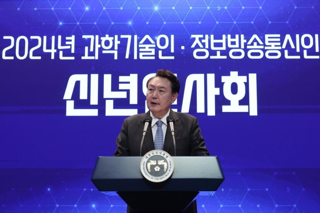 윤석열 대통령이 지난 5일 서울 성북구 한국과학기술연구원(KIST)에서 열린 ‘2024년 과학기술인·정보방송통신인 신년 인사회’에 참석해 발언하고 있다. 대통령실사진기자단