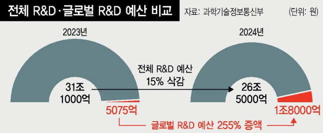 지난 5일 윤 대통령은 서울 성북구 한국과학기술연구원에서 열린 ‘2024년 과학기술인·정보방송통신인 신년 인사회’에서 “임기 중 연구개발 예산을 대폭 확대하고, 혁신적·도전적인 연구개발은 돈이 얼마가 들어가든 전폭적으로 지원하겠다”고 말했다. 또 “예산 문제는 정부에 맡겨놓으시고 여러분은 세계 최고를 향해 마음껏 도전하시기 바란다”고도 했다. 얼마 전 연구개발 예산을 크게 삭감해놓고 “임기 중 대폭 확대”하겠다는, 앞뒤가 맞지 않는 발언이었다. 이날 한 출연연의 구내식당에서 연구원들은 윤 대통령의 모순적 발언을 해석하려 하면서 글로벌 연구개발 문제를 꺼냈다. 글로벌 연구개발이란 외국 연구기관과의 공동 협력 알앤디를 뜻한다. 한 연구원이 입을 열었다. “대통령이 전체 연구개발 예산을 크게 줄이면서 글로벌 연구개발 예산은 뜬금없이 3배나 늘렸어요.” 실제로 글로벌 연구개발 예산은 지난해 5075억원에서 올해 1조8천억원으로 3배 이상 늘었다.