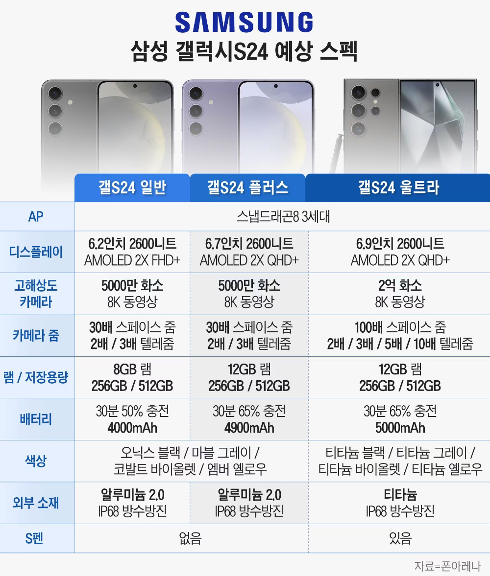 갤럭시 S24 시리즈는 기본, 플러스, 울트라 3종으로 구성될 예정이다.