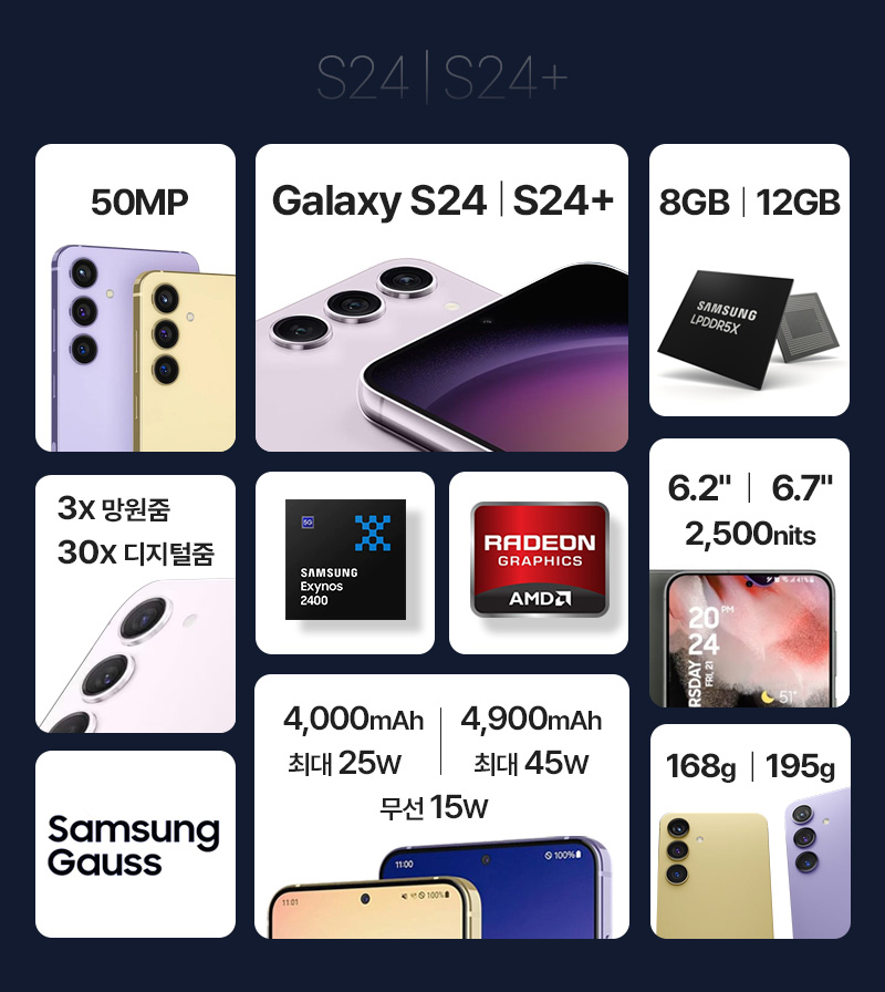 - S24 기본 및 플러스 모델 : 50MP 광각렌즈 3배 줌 지원. 10MP 망원, 12MP 초광각 탑재.