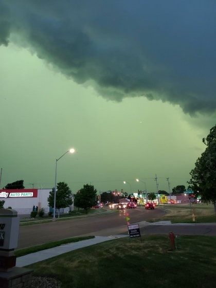 뇌우나 우박을 동반하기도 한다. 초록하늘 현상은 시속 155~160km의 강풍이 불며 석양의 노란빛과 수분을 머금은 공기가 흡수한 파란빛이 섞여 만들어진 진귀한 풍경이다.