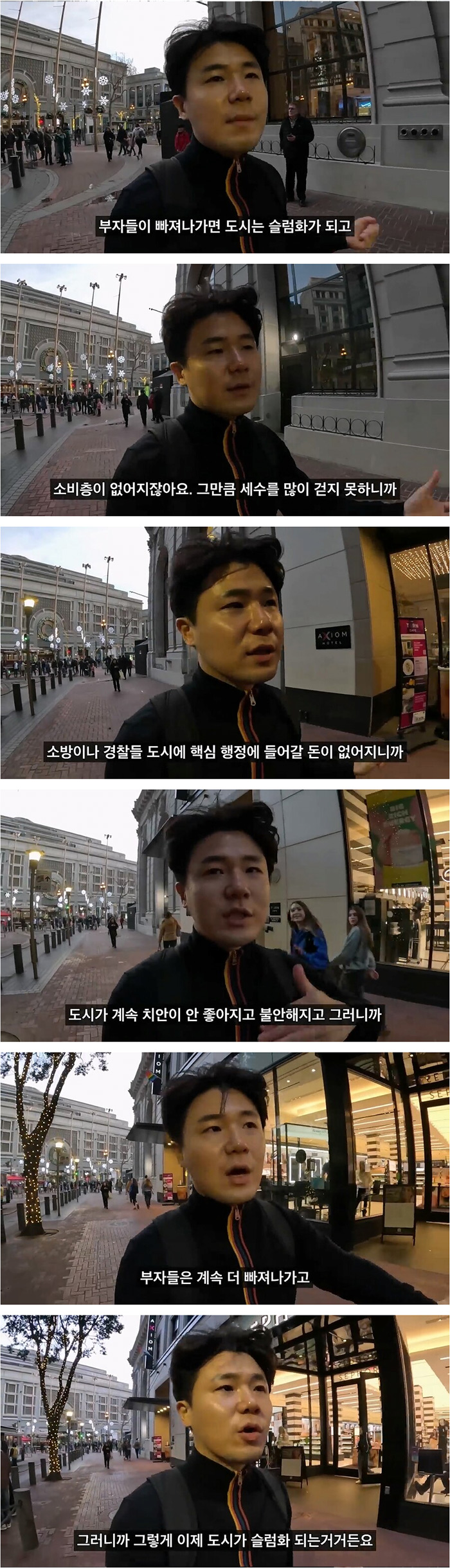 미국의 파리라 불리던, '피어39'과 '알카트라즈'로 유명한 안전한 도시의 탑이였던 샌프란시스코는 현재 도시가 마구 녹고 있다. 범죄자 급증과 마약중독자의 급증, 정부의 약탈에 대한 면죄 제도로 유명한 기업들이 손절하고 모두 사라졌다.
